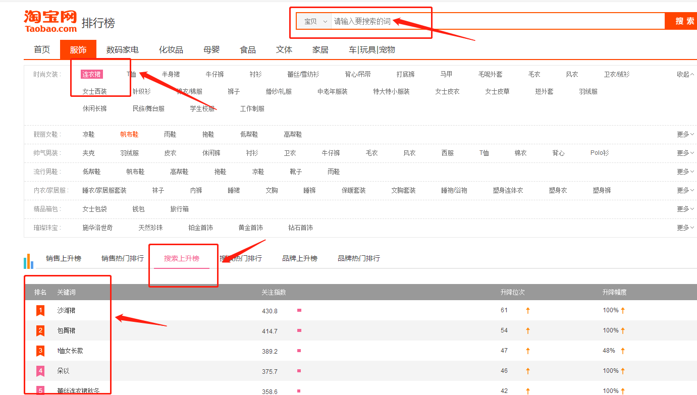3. 淘宝上升词选款:选择最近搜索上升词,淘宝首页搜索框——更多——选择类目——选择搜索上升榜