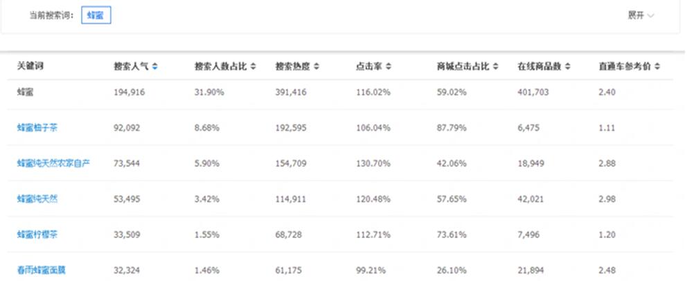 1、蜂蜜是一个大词,并且类目的跨度有点大,相关的关键词涵盖多个类目;